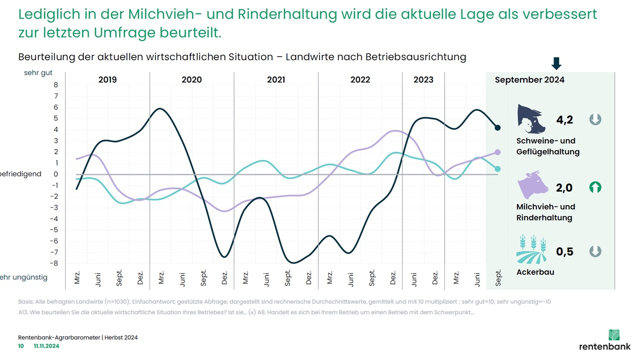 Erste betriebswirtschaftliche Analysen zum Jahresabschluss 2023/2024 sowie das Konjunkturbarometer der Landwirtschaftlichen Rentenbank zeigen, dass sich die Wirtschaftlichkeit in vielen Betriebszweigen deutlich nach unten bewegt und kaum noch ein Betrieb bereit ist zu investieren. Die anhaltend unsicheren politischen Zeiten und die Ungewissheit zur zukünftigen Ausrichtung spiegeln sich in den Ergebnissen wider.