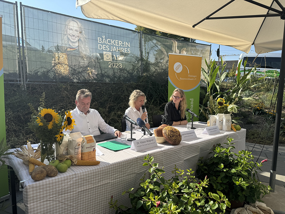 „Durch all diese Umstände verfehlte der Weizen oftmals seine Qualität und das ist besonders bedauerlich, da Thüringen für den Anbau von Eliteweizen und Qualitätsweizen bekannt ist. Diese Weizensorten, die aufgrund ihrer hohen Inhaltsstoffe, wie Protein, besonders interessant für Bäckereien und Industriebäckereien sind, machen einen bedeutenden Teil unseres landwirtschaftlichen Ertrages aus. Unsere Erwartungen waren gerade im Bereich des Qualitätsweizens hoch, doch die Zielqualitäten wurden oft nicht erreicht“, so Wagner. Der Anbau von Thüringer Elite- und Qualitätsweizen wird nicht nur aufgrund des unberechenbaren Wetters, sondern auch durch eine vorgeschriebene reduzierte Düngung erschwert. Daher fordert der TBV praxistaugliche Regelungen im Bereich Düngung und Pflanzenschutz, mehr Offenheit für Innovationen und fachliche anstatt ideologiegetriebener Entscheidungen. „Die hohe Qualität unseres Weizens ist ein Markenzeichen unseres Freistaates und es ist unser Ziel, diese Standards trotz der Widrigkeiten aufrechtzuerhalten – gerade mit Blick auf unsere heimischen Bäckereien“, so Wagner und übergab das Wort an die Gastgeberin der diesjährigen Erntepressekonferenz Celestina Brandt. Sie führt eine Traditionsbäckerei, die in der vierten Generation Backwaren aus Meisterhand fertigt. Brand ist zudem Brotsommelière, Thüringer Landesinnungsmeisterin und Bäckerin des Jahres 2023. Sie berichtete im Rahmen der Pressekonferenz über die Zusammenarbeit mit Landwirten, ihre Branche mit all ihren Herausforderungen und ihre innovativen Ideen vom Drive-In bis zum 24-Stunden-Automaten.